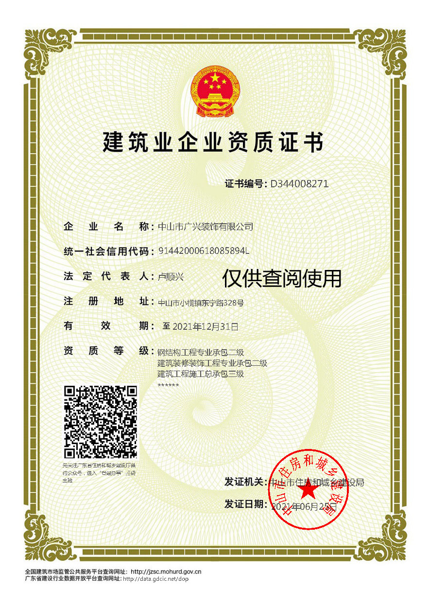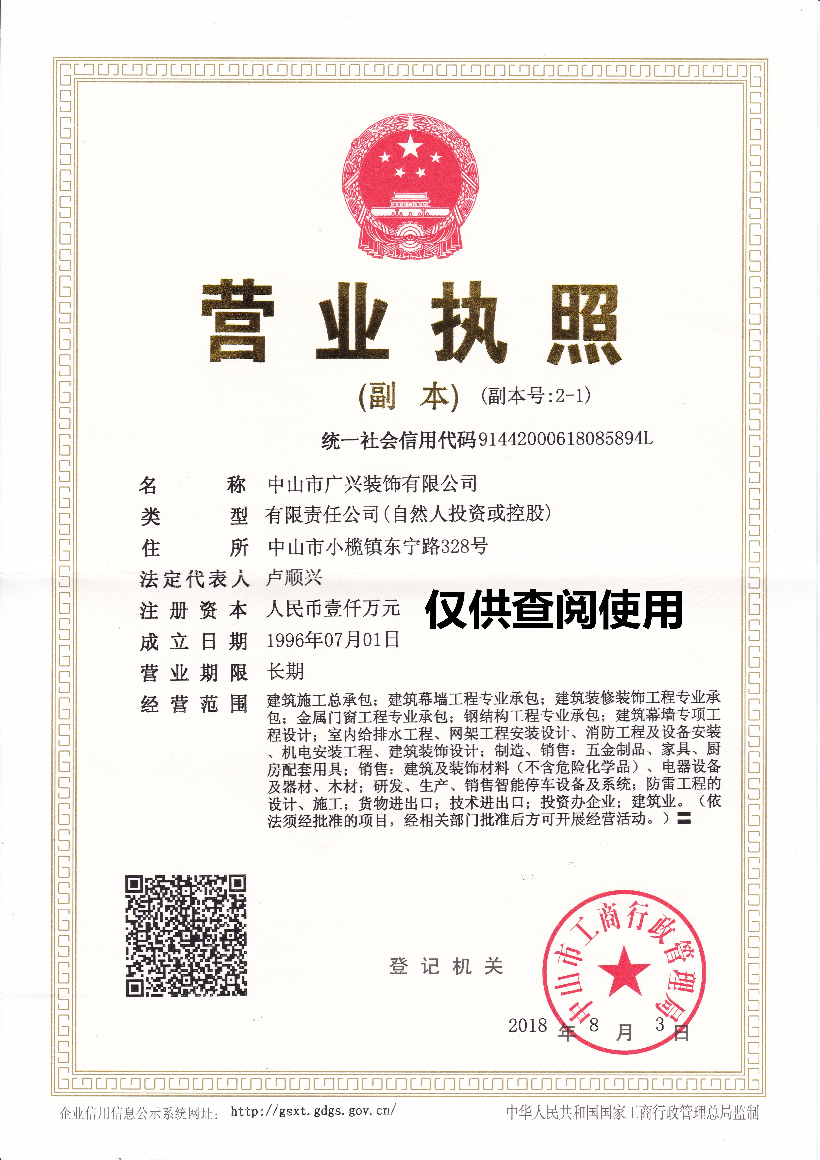 中山市廣興裝飾有限公司創(chuàng)建于1985年,是一家集鋼結(jié)構(gòu)、建筑、幕墻、裝修裝飾、鋁合金門(mén)窗專(zhuān)業(yè)的設(shè)計(jì)、加工及施工安裝為一體的大型綜合性建筑企業(yè)。公司總部位于中山市小欖鎮(zhèn),在中山和珠海均建有生產(chǎn)加工基地,總占地面積60000多平方米。